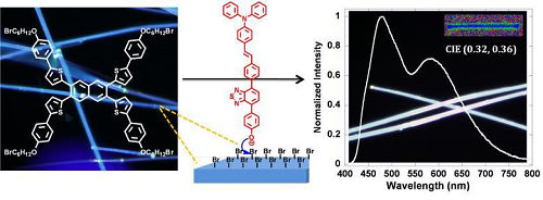 ͨ�^��Һ�����ӹ�һ�ĩ��ͨ�^������ȡ�����ЙC���h�Y�����@���˱��溬����ԭ�ӵ��ЙCһ�S����ԓ�Y���ڹ��w��B�°l�����{ɫ�ɹ⣬�������һ��������ȡ�������l�����淴��������n�}�M�ϳ���һ�����з��u���ļtɫȾ�ϣ��ڲ��ܽ��ЙC�����Ҵ����M���˱����SN2ȡ���������ɹ���ԓ�tɫȾ��ͨ�^���r�I�ϵķ�ʽ�������һ�S�ЙC�����棬�����ñ�������M�е�ݗ�������D�ƌ�ԭ�Ȱl���{��������Ԟ�l��⡣ͨ�^��l�����ƣ�����n�}�M��K�@���˵����c������CIE�� 0.32, 0.36���İ�l�䡣����n�}�Mͨ�^˲�B�ɹ⣬����ɹ���裬�w���|�V�Ȍ���C������Y��Դ���ڱ���һ�ӷ������������Ӱl���Ļ��W������ԓ������ԓ�I��ȵ�һ�Ό��ЙC�{���w�M�еı��滯�W���������ͨ�^����η��ӌ����ص�׃������һ�S�{�Y�����������W���|�����Ժ��M�и�����s�����������ﻯ�W�����ṩ�˻��A����J. Am. Chem. Soc. 2010, 132, 15872�C15874.��