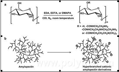 Figure 1. Synthesis of the hyperbranched cationic amylopectin derivatives conjugated with oligoamine residues: (a) chemical reaction and (b) proposed structures of amylopctin and its hyperbranched cationic derivatives.