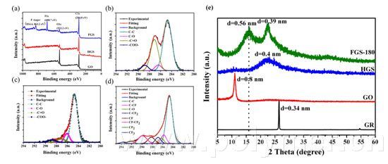 (a-d) ����ʯīϩ��ˮ��߀ԭʯīϩ��ˮ�����ʯīϩ��XPSȫ�V����C1s���V��(e) ����ʯīϩ��ˮ��߀ԭʯīϩ��ˮ�����ʯīϩ��XRD�D��