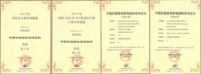 1)Molecular Design of Photovoltaic Materials for Polymer Solar Cells: Toward Suitable Electronic Energy Levels and Broad Absorption, Li, YF, Accounts of Chemical Research, 2012, 45(5):723-733.