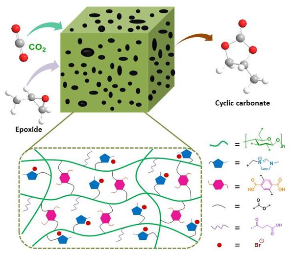 功能高分子材料是一類非常重要的聚合物,是自然科學(xué)中應(yīng)用最廣泛的材料。離子液體功能化聚合物材料被稱為聚(離子液體) (PILs),是由單體重復(fù)單元內(nèi)的聚合物主鏈和離子液體(ILs)組成的聚電解質(zhì)。近年來,PILs材料獨(dú)特的物理性能和結(jié)構(gòu)特點(diǎn)、離子液體的可設(shè)計(jì)性以及聚合物段豐富的PILs性能和應(yīng)用能力引起了聚合物和材料科學(xué)領(lǐng)域的廣泛關(guān)注。纖維素聚離子液體(Cellulose-PILs)是一類離子液體功能化高分子材料,具有熱穩(wěn)定性、不可燃性、高離子導(dǎo)電性、寬電化學(xué)穩(wěn)定窗口、生物降解性和生物相容性等離子液體和生物基聚合物的雙重特性,被廣泛應(yīng)用于制藥、造紙、環(huán)境保護(hù)、水處理、化學(xué)傳感、紡織印染工業(yè)、基因轉(zhuǎn)染、藥物輸送、抗菌和生物醫(yī)學(xué)等領(lǐng)域。因此,設(shè)計(jì)與制備纖維素基聚離子液體材料并對(duì)其應(yīng)用研究已成為人們關(guān)注的焦點(diǎn)。近日,貴州大學(xué)材料與冶金學(xué)院謝海波教授課題組在環(huán)境材料領(lǐng)域TOP期刊《ACSSustainable Chemistry & Engineering》(JCR一區(qū)TOP期刊,IF=9.224)發(fā)表重要研究成果“Fabrication of Carboxylic Acid and ImidazoliumIonic Liquid Functionalized Porous Cellulosic Materials for the Efficient Conversion of Carbon Dioxide into Cyclic Carbonates”, (DOI: 10.1021/acssuschemeng.2c06976),論文第一作者為2018級(jí)博士研究生楊云龍,通訊作者為鄭強(qiáng)教授和謝海波教授。該項(xiàng)工作是通過在DBU/DMSO/CO2溶劑體系中溶解纖維素,并且在不添加額外催化劑的情況下,通過酯交換反應(yīng)成功地將ILs錨定在纖維素鏈上,從而實(shí)現(xiàn)原位制備纖維素聚離子液體衍生物材料([Cellmim][Br])(圖1)。為了實(shí)現(xiàn)其更好的應(yīng)用,已有研究表明,具有多孔有機(jī)骨架的聚離子液體材料(ILs-POFs)作為多孔催化劑用于CO2環(huán)加成反應(yīng)中,為反應(yīng)提供更多孔道和催化反應(yīng)位點(diǎn),并取得卓越的催化效果。且具有羧基功能化的ILs可以通過氫鍵激活環(huán)氧化合物,增強(qiáng)其催化活性。基于此,該團(tuán)隊(duì)在不添加額外催化劑的情況下,以鄰苯二甲酸酐和琥珀酸酐為原料,采用原位交聯(lián)反應(yīng)合成了兼具有離子液體和羧酸官能團(tuán)化的纖維素聚離子液體多孔材料(POF-[Cellmim][Br])(圖2)。該策略的特點(diǎn)是同時(shí)將ILs和羧酸官能團(tuán)引入到聚合物基質(zhì)上,為新的PILs設(shè)計(jì)和制備提供了重要見解。此外,作為概念驗(yàn)證,離子液體功能化多孔纖維素材料(POF-[Cellmim][Br])被成功地用作催化劑用于CO2的環(huán)加成反應(yīng)中,獲得了較高的催化效率。該研究為生物基聚離子液體材料的設(shè)計(jì)與制備及其應(yīng)用提供了重要的指導(dǎo)作用。