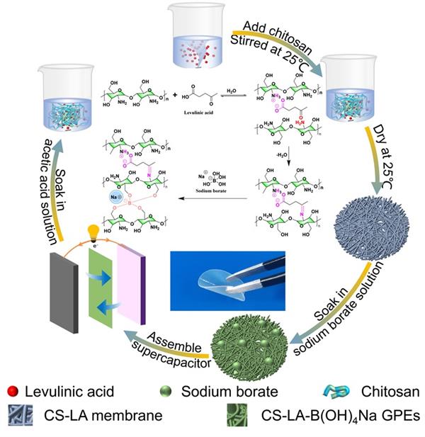 Flexible Supercapacitors”, (DOI:10.1016/ D3GC04263D.),2021級碩士研究生許明偉為論文第一作者,通訊作者為謝海波教授,黃俊特聘教授。該工作基于殼聚糖的結構特點,利用乙酰丙酸(LA)作為質子化試劑使殼聚糖溶于水,并進一步作為交聯(lián)劑與殼聚糖上的氨基形成交聯(lián)聚合物網絡;隨后加入硼酸鈉水溶液,通過硼酸酯鍵形成第二重交聯(lián)網絡,進而制備出雙交聯(lián)功能化殼聚糖基水凝膠(CS-LA-B(OH)4Na)電解質(圖1)。