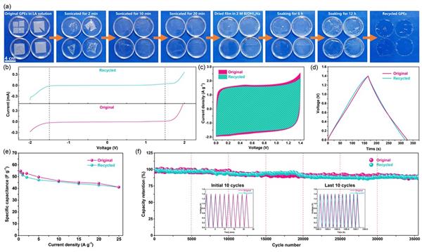 系統(tǒng)地研究了殼聚糖溶解和交聯(lián)的過程,,確認了雙交聯(lián)策略的可行性。所制備的CS-LA-B(OH)4Na電解質具有非常均勻的空隙網絡,且由于硼元素的引入還具有良好的阻燃性能。以超級電容器為應用模型進一步研究了其電化學性能,得益于雙重交聯(lián)網絡結構提供的快速離子通道,所制備的CS-LA-B(OH)4Na電解質具有高的離子電導率(24.02 mS cm-1)和較寬的工作溫度范圍,同時表現(xiàn)出長達五萬次的穩(wěn)定循環(huán)壽命,容量保持率高達86 %(圖2)。此外,制備的柔性超級電容器還可在彎折、重壓等外力條件下正常工作(圖3)。更令人驚喜的是,該電解質即使被剪切、刺穿和切碎,仍然可以實現(xiàn)回收和再利用,且電化學性能沒有受到顯著影響(圖4)。因此,本工作通過利用天然聚合物的結構特征來設計柔性儲能裝置,為可持續(xù)、可回收和阻燃的GPE的設計提供了深入的見解。