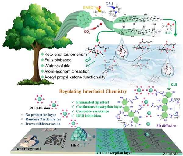為了彌補這一巨大的差距,近日,貴州大學謝海波教授/黃俊特聘教授在國際知名期刊Energy Storage Materials(IF=18.9)上發表題為“Regulating Interfacial Chemistry with Biobased Multifunctional Cellulose Levulinate Ester for Highly Reversible Zinc Ion Batteries”的研究論文,第一作者為團隊博士研究生陳奎。通過利用課題組發展的纖維素CO2基溶解體系,即1,8-二氮雜雙環[5.4.0]十一碳-7-烯/二甲基亞砜/二氧化碳(DBU/DMSO/CO2)纖維素溶解體系,通過α-當歸內酯(α-AL,一種源自碳水化合物的生物基化學物質)與纖維素合成了一種全新的生物基多功能纖維素乙酰丙酸酯(CLE)。CLE結構特征在于乙酰丙基酮,具有獨特的酮-烯醇互變異構化學,能夠產生新的氫鍵受體和供體,使得CLE兼具纖維素本征特性和良好的水溶性。研究表明,CLE上豐富的官能團(醚和酮、烯醇、羥基、酯基)協同作用,加速Zn2+脫溶劑化、抑制副反應產生和減緩鋅枝晶生長。研究發現, CLE可以優先吸附在Zn陽極表面,CLE添加劑可以促進OTf?陰離子形成富含ZnCO3、ZnS和ZnF2的有機-無機雙層固體電解質界面層(SEI),從而增強了Zn2+傳輸動力學.緩解了鋅陽極的腐蝕,提升了電池的整體性能。因此,在1 mA cm-2電流密度下實現長達2800小時的對鋅循環壽命。Zn//MnO2在2 A g-1電流密度下經過3000循環后,容量保持率高達78.6%。本研究利用纖維素分子工程化學,開發了具有優異特性的CLE添加劑,為實現無枝晶、高耐受和長壽命的水系ZIBs提供了新視角。