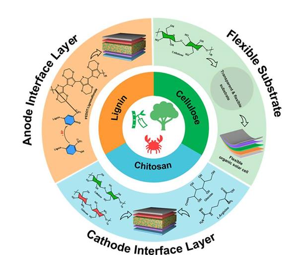 圖1 纖維素、殼聚糖和木質(zhì)素等天然材料作為有機(jī)光伏的柔性基底材料、陰極界面材料和陽(yáng)極界面材料