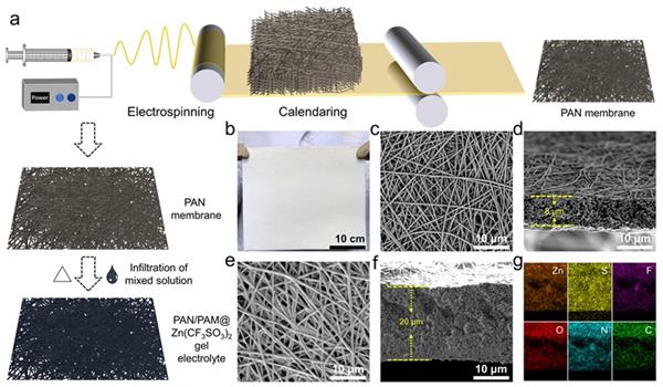 柔性和可穿戴電子產(chǎn)品的出現(xiàn)激發(fā)了大量關(guān)于強(qiáng)大、可靠、低成本、具有優(yōu)異電化學(xué)性能的可穿戴儲能設(shè)備的研究。目前,柔性鋰離子電池(LIB)和超級電容器(SC)被認(rèn)為是柔性和可穿戴電子設(shè)備中兩種有前途的儲能設(shè)備,但是它們的功率密度和循環(huán)壽命、低能量密度很有限。為了解決這些缺點(diǎn),利用電容器型電極和電池型電極結(jié)合的混合型電容器(HSC)是最有前景的提高設(shè)備能量密度的方法。鋅離子混合超級電容器(ZHSC)由于其結(jié)合了鋅離子電池(ZIB)的優(yōu)異性能、高安全性、無毒性和豐富的鋅資源等優(yōu)點(diǎn),被認(rèn)為是最有潛力的儲能器件之一。然而,由于使用不安全的水溶液電解質(zhì)的限制,導(dǎo)致鋅枝晶形成明顯,副反應(yīng),陽極腐蝕,并且在日常使用中無法承受較大的機(jī)械沖擊和損害,包括被撞擊、撕裂、刺穿或折疊。為了解決上述問題,設(shè)計一種可擴(kuò)展的、薄的、高性能的基于聚丙烯腈(PAN)和聚丙烯酰胺(PAM)的分級結(jié)構(gòu)凝膠電解質(zhì),提出了一種具有高電化學(xué)功能的極其安全、靈活的準(zhǔn)固態(tài)ZHSC。