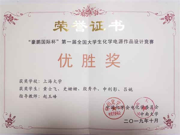 黃士飛博士率隊參加2019 年“豪鵬國際杯”第一屆全國大學生化學電源作品設計競賽獲獎