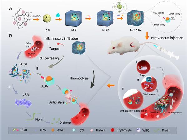 在這項研究工作中,作者將尿激酶型纖溶酶原激活劑(uPA)和抗炎藥物阿司匹林(乙酰水楊酸,ASA)加載到具有pH響應性的CaCO3/環糊精交聯金屬有機框架(MC)上,通過分級功能化技術構建精準靶向血小板的雙重給藥溶栓體系(CaCO3/PDA@CD-MOFs-RGD/uPA/ASA)(MCRUA)。該體系可智能靶向活化血小板,在血栓部位特殊的病理微環境中解體釋放uPA和ASA,從而改善血栓內的炎癥環境,增強抗血小板聚集效應,促進協同溶栓治療,并能有效防止血管再栓塞的發生,實現短效溶栓和長效抗凝的作用。