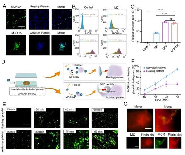 該納米體系具有良好的靶向能力,其靶向效率可達96%。圖3A顯示了MCRUA納米粒子在靜息或活化的血小板表面的結合和保留的熒光顯微鏡圖像示例。與靜息血小板相比,活化的血小板具有更大的藍色和綠色熒光強度重疊,這表明MCRUA更容易附著在活化的血小板上。同時藥物負載沒有使靶向率降低,其靶向效率沒有顯著性差異。