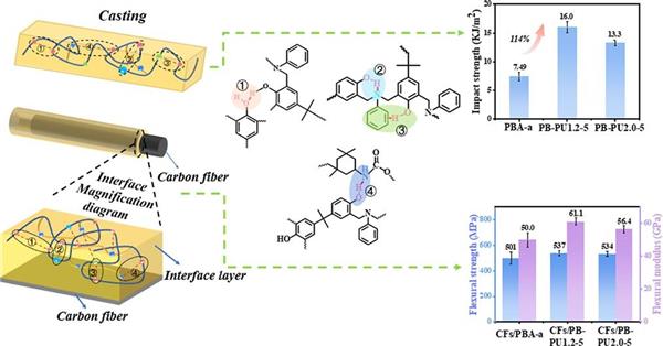 雖然聚苯并惡嗪和碳纖維由于其優異的機械財產而具有吸引力,但聚苯并惡嗪的韌性較低,碳纖維具有惰性表面。通過將新設計和合成的具有不同鏈長的姜黃素基聚氨酯摻入聚苯并噁嗪(PU1.2和PU2.0)和碳纖維表面,我們能夠引入不同量的氫鍵。我們的改性聚苯并惡嗪表現出增強的機械性能,例如較高的韌性和抗彎強度,分別高達16.0 kJ/m2和147 MPa。相比之下,我們的表面改性碳纖維增強苯并惡嗪復合材料的彎曲強度高達537MPa。此外,表面改性碳纖維增強聚苯并惡嗪的機械性能得到改善,是因為姜黃素基聚氨酯通過引入具有高濃度氫鍵的軟層,可以顯著提高基體與樹脂之間的界面粘附性。我們的研究不僅改善了聚苯并惡嗪和碳纖維增強聚合物復合材料的機械性能,而且揭示了一種通過調節氫鍵含量來提高熱固性樹脂的機械性能和碳纖維界面粘合性的新方法。