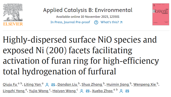 近日,齊魯工業大學(山東省科學院)材料科學與工程學部趙學波教授/閆理停副教授團隊與遼寧石油化工大學王海彥教授團隊合作,在Applied Catalysis B: Environmental(IF:22.1)上發表題為“Highly-dispersed surface NiO species and exposed Ni (200) facets facilitating activation of furan ring for high-efficiency total hydrogenation of furfural”的研究論文(DOI:10.1016/j.apcatb.2023.123501),深入探究了Ni基催化劑在糠醛轉化為四氫糠醇反應中的反應機理和本征活性位點。其中,Ni/C-400樣品在溫和條件下四氫糠醇的產率高達98.5%。通過XPS和XAS測試證實了Ni/C-400樣品中存在豐富的與催化活性密切相關的表面NiO物種。研究表明,Ni金屬微觀結構的可控調節對反應物的吸附能力有極其顯著的影響,從而影響加氫反應的活性。