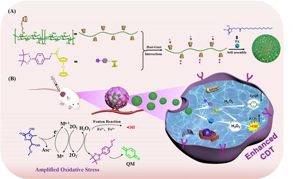化學動力學治療在近年來得到大家的廣泛關注,其中在CDT治療中,內源H2O2不足,還原性GSH過表達,載體主動靶向性和生物降解性不足等問題導致其難以達到理想的療效。在本課題中,我們使用環糊精改性的透明質酸HA-CD以及二茂鐵-苯硼酸頻哪醇酯綴合物Fc-BE構筑主客體型超分子聚合物,并載入檸檬酸棕櫚酸酯PA。課題中所制備的超分子納米載體可通過CD44受體介導的主動靶向作用進入細胞并刺激響應性解離釋放PA來提升胞內H2O2水平,從而提高CDT效率,而Fc-BE可通過芳基硼酸酯的重排作用釋放醌甲基化合物消耗GSH,從而放大胞內氧化分壓,從而實現放大的CDT治療。論文近期被ACS Applied Materials & Interfaces接收(SCI一區,IF:10.383)