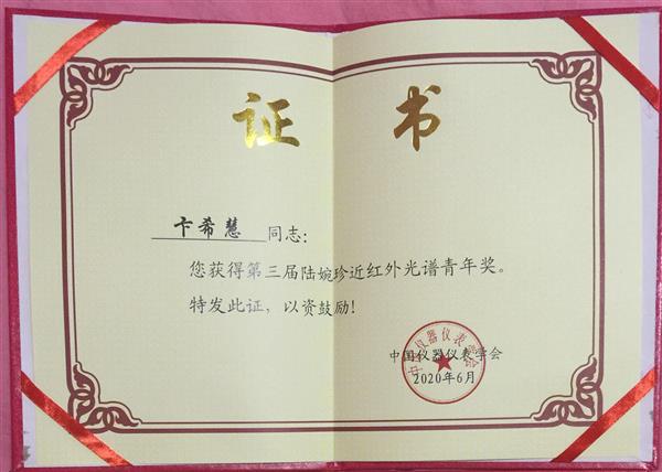 祝賀卞希慧在2020年獲得第三屆陸婉珍近紅外光譜青年獎。