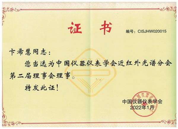 祝賀卞?;弁?022年被當選為中國儀器儀表學會近紅外光譜分會第二屆理事會理事。