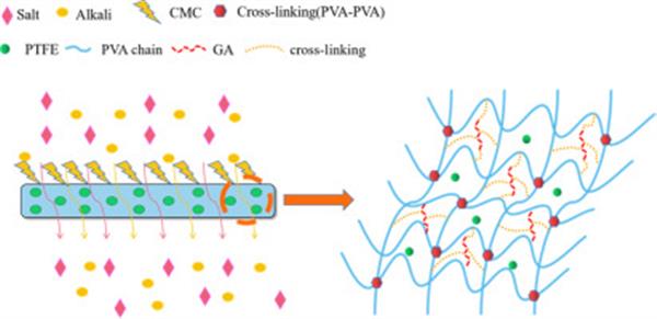 Carboxymethyl Cellulose Sodium (CMC) is widely used in paper-making and textile industries, and the treatment of CMC wastewater containing salt and alkali has become one of the hot spots in the field of wastewater treatment. In this study, poly(vinyl alcohol) (PVA)/polytetrafluoroethylene (PTFE) membranes were prepared through non-solvent induced phase inversion (NIPS) and cross-linking for the separation of CMC and salt-alkali. Scanning electron microscopy (SEM), Fourier transform infrared spectroscopy (FTIR) and X-ray photoelectron spectroscopy (XPS) were used to characterize the morphology and surface properties of the membranes. The results showed that both heat cross-linking and chemical cross-linking with glutaraldehyde (GA) improved the structural stability of the PVA/PTFE membranes. The salt-alkali optional transmitting rate (OTR), the CMC rejection rate, and the flux of the heat cross-linked PVA/PTFE membrane and chemical cross-linked PVA/PTFE membrane are 93.0%, 99.3%, 220.00 (L/m2h) and 93.4%, 99.4%, 89.20 (L/m2h) at 0.2 MPa, respectively. Besides, the GA cross-linked PVA/PTFE membrane showed stable and efficient separation performance in the test of separating CMC. Therefore, the resultant membrane can be used for the separation of CMC, salt, and alkali, providing a new idea for the treatment of high-salt-alkali cellulose wastewater.