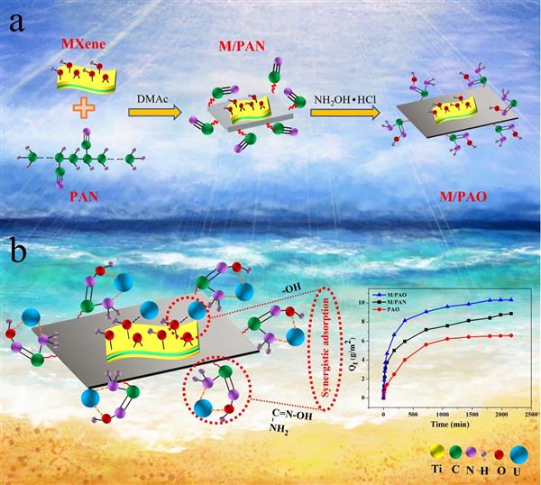 Two-dimensional metal carbides (MXene) and amidoxime-based materials have attracted more and more attention in heavy metal adsorption. Herein, we prepared a mixed matrix membrane of amidoximized poly-acrylonitrile with MXene particles by a simple phase separation method (M/PAO mixed matrix membrane). The M/PAO mixed matrix membrane had excellent U(VI) ion selectivity compared to vanadium. Under the syner-gistic adsorption of the two functional adsorption units, the maximum adsorption capacity can reach 10.31 g/m2