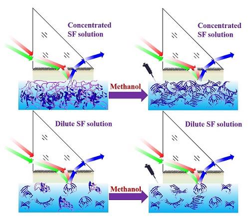 我們發(fā)現(xiàn),界面上蠶絲蛋白二級(jí)結(jié)構(gòu)的形成與否與溶液的濃度直接關(guān)聯(lián)。我們借用了高分子臨界交疊濃度(C*)的概念。在C*以上,由于溶液中蛋白質(zhì)分子鏈相互作用,在聚苯乙烯界面上形不成有序的二級(jí)結(jié)構(gòu),只有在外場(甲醇)的作用下才可以;在C*以下,由于溶液中蛋白質(zhì)分子鏈處于無擾單鏈狀態(tài),在聚苯乙烯界面上直接可形成有序的二級(jí)結(jié)構(gòu)。這說明鏈鏈交疊或空間受限影響了蛋白質(zhì)分子鏈折疊形成二級(jí)結(jié)構(gòu),在蛋白質(zhì)的科學(xué)研究和工程化應(yīng)用的過程中必須作為一個(gè)重要維度加以考慮。