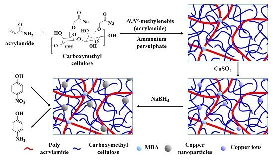 A new bio-based bilateral hydrogel containing carboxymethyl cellulose (CMC) and polyacrylamide (PAM) was prepared for the wastewater remediation. The obtained CMC/PAM composite hydrogel reveals a strong single-ion affinity for copper (CuII), lead (PbII) and cadmium (CdII) ions, as well as multi-ion absorbability with its equilibrium data following the Langmuir adsorption model and its adsorption process abiding by a second-order kinetics. To demonstrate its recycled use for the metal ions, the adsorbed CuII ions in the hydrogel were reduced in situ to form homogeneously dispersed Cu nanoparticles (NPs), leading to the Cu NPs-loaded CMC/PAM hydrogel. Reduction of 4-nitrophenol to 4-aminophenol with high efficiency was successfully achieved by this Cu NPs-loaded CMC/PAM hydrogel, verifying the hydrogel’s dual functionalities towards the wastewater treatment and catalytic application.