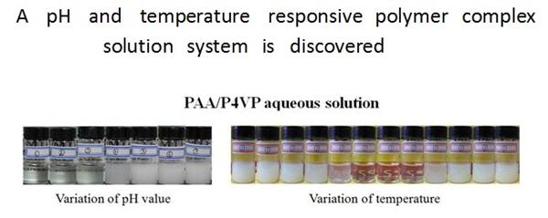 A novel thermo- and pH- responsive poly(acrylic acid) (PAA)/poly(4-vinylpyridine) (P4VP) aqueous material with an upper critical solution temperature (UCST) was developed in this study. It was found that the formation of the aqueous complex material was caused by the deprotonation of pyridinium groups of P4VP molecules and consequent hydrogen bonding formation between pyridine and carboxylic groups. This aqueous material exhibited significant reversible transition behaviors between the turbid colloidal and transparent solution states upon altering the pH and temperature values. Furthermore, the correlation between the solution pH and the upper critical solution temperature (UCST) enables us to design responsive aqueous materials with a broadly adjustable transition temperature range.