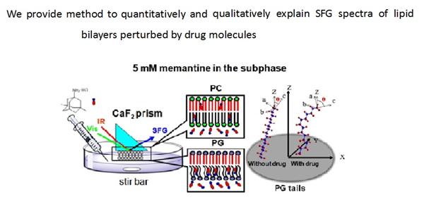 negatively charged PG lipid bilayers) at the molecular level in real time and in situ. SFG results revealed how the memantine affected these lipid bilayers in terms of the lipid dynamics, average tilt angle (θ), as well as angle distribution width (σ). It was found that memantine could adsorb onto the zwitterionic PC surface but did not affect the flip-flop rate of the PC bilayer even in the presence of 5.0 mM memantine, indicating the negligible interaction between memantine and the PC bilayer. However, for the negatively charged PG bilayer, it was found that the outer PG leaflet could be significantly destroyed by memantine at a relatively low memantine concentration (1.0 mM), while the inner PG leaflet remained intact. Besides, the θ and σ of CD3 groups in the outer PG lipid leaflet were calculated to be ~82.0° and ~19.5° after adding 5 mM memantine, respectively, indicating that these CD3 groups were prone to lie down at the membrane surface (versus the surface normal) with the addition of 5 mM memantine while nearly standing up without the addition of drug molecules. These monolayer- and molecular-level results could hardly be obtained by other techniques. To the best of our knowledge, this is the first experimental attempt to quantify the drug-induced orientational changes of lipid molecules within a lipid bilayer. The present work provided an in-depth understanding on the interaction between memantine and model cell membranes, which will potentially benefit the development of new drugs for neurodegenerative diseases involving drug?membrane interaction.