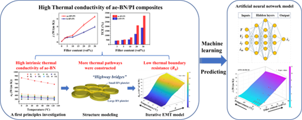 Demand for thermal management materials (TMMs) with efficient in-plane heat dissipation has grown with the advancement of intelligent wireless communication equipment. Herein, polydisperse hexagonal boron nitride (ae-BN) in the range of micrometers to nanometers via aqueous-assisted exfoliation. First principles investigation revealed that ae-BN possess high intrinsic thermal conductivity. A series of ae-BN/PI composites were then fabricated through facile methods: vacuum-filtration and hot-pressing. The ae-BN/PI composites with 30 vol% ae-BN loading exhibited superior in-plane thermal conductivity (6.57 W/(m·K) compared to pristine h-BN/PI composite (3.92 W/(m·K)). SEM images and structural modeling of ae-BN/PI composites revealed that thermal conduction pathways constructed in the composites continuously increased with ae-BN content, attributing to an increased contact probability in composites with higher content of ae-BN. Reduction in thermal boundary resistance of ae-BN/PI composites was proved by our iterative EMT model. In-plane thermal conductivity of ae-BN/PI composites with different fillers’ contents at variable temperatures were predicted by machine learning technique, viz. artificial neural network (ANN) model. In brief, ae-BN/PI composites with high thermal conductivity, electrical insulation, thermal stability, and mechanical strength were successfully fabricated. The heat conduction mechanism of ae-BN/PI composites was investigated, serving as an important piece of puzzle for the advancement in TMMs of the advanced electronic devices.