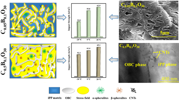 等規聚丙烯(iPP)是一種常用的熱塑性工程塑料材料,在過去的幾十年里被廣泛的用來制造購物袋、管材、農用薄膜以及其他的工業應用。然而,隨著使用溫度的降低,會極大地影響聚丙烯的韌性,會導致其由韌性到脆性的轉變,造成聚丙烯復合材料力學性能的惡化,這也大大的限制了聚丙烯管材在極端寒冷環境下的進一步應用。課題組針對聚丙烯耐寒問題,通過對聚丙烯復合材料內部微結構的調控,使iPP/0.1wt% β-NAs/30 wt% OBC共混體系具有超高的低溫沖擊韌性。與純iPP相比,在僅添加0.5wt% CNTs時,可使iPP/0.1wt% β-NAs/30 wt% OBC復合材料在使用溫度為-20℃時,低溫沖擊韌性高達52.2kJ/m2,其中沖擊強度增加幅度約2386%。通過CNTs添加含量的調控可使β-iPP復合材料形成共連續的相形態,這是復合材料在低溫環境下能顯著增強應力消散的關鍵。此外,CNTs在iPP和OBC相之間的分布以及β-NAs和OBC誘導的自增韌β-晶體的存在將有助于進一步提高iPP基復合材料的低溫沖擊強度。本課題組提出了一種切實可行的增強復合材料低溫韌性的策略,擴大了其在工業領域的應用潛力。