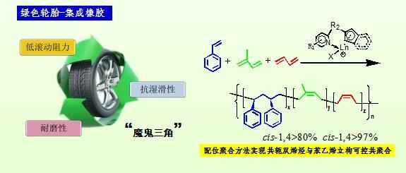 共軛雙烯烴可以進行順式1,4-、反式1,4-、1,2-(或3,4-)等區域選擇性聚合,以及1,2-(或3,4-)間同、全同、無規等區域、立體選擇性聚合,得到結構變化多樣的聚合產物。其中高順式1,4-聚異戊二烯和聚丁二烯是工業、國防和航天應用最廣泛的橡膠。而反式1,4- 1,2-或3,4-聚雙烯烴是醫用、或高性能橡膠的重要組分。生物體系的選擇性在溫和條件下可以達到100%,比如天然橡膠中異戊二烯的順式1,4-結構可達100%,但對于合成催化劑實現97%以上就非常困難。然而結構的細微差別會導致產物性能的極大變化。因此開發易合成、高催化活性、選擇性、適于工業化生產的催化體系,一直是學術界特別是工業界非常具有吸引力而又十分棘手的課題之一。我們采用新的催化劑設計理念,合成了一系列高選擇性催化體系,并研究了選擇性控制機理。