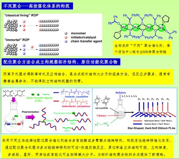 聚烯烴等塑料的發展非常迅速,在生產和生活中的作用不可或缺。但對環境造成的白色污染和對石油資源的依賴也成為人類生存與發展極其沉重的負擔。因此,不依賴于石油資源的材料或使用后可生物降解高分子材料越來越受到研究者、公司和政府的關注。聚己內酯、聚丙交酯和聚碳酸酯是代表性的可生物降解高分子材料,其單體來源豐富、廉價而且是非石油資源,降解后的產物不污染環境。它們廣泛應用于組織工程和緩釋、控釋和靶向等藥物制劑,并有望部分取代聚烯烴等通用塑料。我們合成了一系列稀土金屬有機配合物,它們可以催化丙交酯聚合,在數分鐘內可達100%轉化率;可以催化己內酯聚合獲得超高分子量的聚脂;可以單組分催化環氧烷與二氧化碳的交替共聚合,得到高分子量、高碳酸酯含量的聚合物。目前,本課題組正在合成新型催化劑旨在進一步提高其催化活性、對單體的立體選擇性,及其與非極性單體的共聚性,獲得性能多元化、組成可調節的新材料。