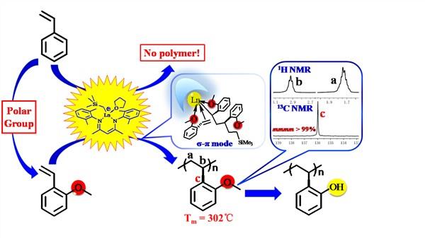 ④利用吡啶芴基釔催化劑率先實現了“未保護”的極性苯乙烯單體與苯乙烯的高活性、高間規選擇性共聚合,并獲得高分子量的共聚物。