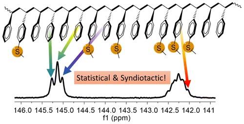 ⑤使用弱極性的對甲硫基苯乙烯(MTS)作為功能化單體,在芴基吡啶釔雙烷基配合物-硼鹽-三異丁基鋁的催化下,實現了該該單體的高活性(45.1×104g molY-1h-1)、高間規選擇性(rrrr >99%)聚合。所得MTS均聚物的分子量與理論分子量相近,最高可高達17萬,而分子量分布(PDI)在1.3-1.9之間,說明該單體對催化劑的毒化作用很小,且聚合可控。