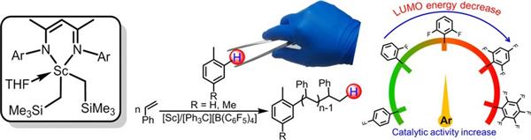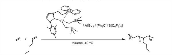 乙烯與α-烯烴形成線性低密度聚乙烯與普通聚乙烯相比具有低密度、結晶性和剛性的優點,目前可以催化乙烯與α-烯烴共聚合的稀土金屬催化劑極少,因此,我們致力于探究高效共聚乙烯與α-烯烴的催化體系。研究發現,芴基官能化卡賓鈧配合物高效催化乙烯與α-烯烴共聚。