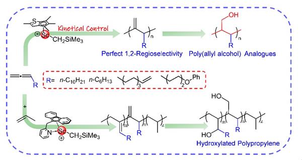 將聯烯單體進行反常規的高1,2-區域選擇性聚合,并在此基礎上實現了丙烯與聯烯共聚。將得到的均聚物和共聚物中高活性的端雙鍵羥基化,分別得到聚烯丙醇類似物和羥基含量高達26.5mol%的聚丙烯。機理研究表明聯烯完美的1,2-選擇性聚合是動力學驅動而非熱力學控制過程。