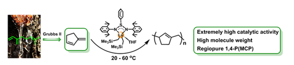 3-亞甲基環戊烯(MCP)是一種剛性結構的萜烯基共軛雙烯單體,由β-月桂烯經Grubbs II催化劑關環反應生成。無法使用自由基聚合和陰離子聚合高效聚合MCP,使用陽離子高效聚合的條件過于苛刻。為了尋找一種有效催化MCP聚合方法,最近,我們用稀土催化劑對MCP進行了聚合研究,詳細研究了催化劑螯合配體的結構對MCP聚合活性和立構選擇性的影響規律,篩選出了一種NSN-型配體螯合的稀土镥催化體系,發現該催化體系對MCP單體聚合具有極高的催化活性和1,4-立構選擇性,所制得1,4-聚MCP的分子量隨單體與催化劑摩爾比成比例增長(可達20.0×104 g/mol)。這是首例有關配位聚合方法高活性、高選擇性制備高分子量1,4-聚MCP的研究論文。