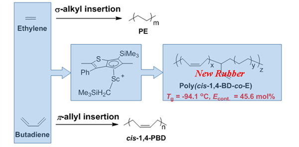 將乙烯單元引入聚丁二烯骨架是合成先進橡膠材料的一種方法,由于兩種單體的不同聚合機理和不同的反應活性,這是一個研究難題。迄今為止,僅獲得具有丁二烯單元反-1,4-和1,2-的共聚物。我們通過使用噻吩稠合的環戊二烯基鈧配合物,首次獲得了具有順-1,4-丁二烯結構單元的共聚物。研究了催化劑的位阻和電子效應以及單體配位模式對催化體系的活性、反應的選擇性以及聚合物序列長度的影響,并闡明了其反應機理。聚合物中乙烯單體含量高達45mol%,并且具有80%順式-1,4選擇性,Tg = -94℃。這種新型乙烯基橡膠材料具有短聚乙烯序列而沒有明顯的熔點。該橡膠表現了優異的抗流動性能和強拉伸強度。