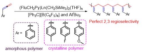 稀土金屬催化體系催化苯基聯烯類單體的聚合,可以實現對于苯基聯烯、對甲基苯基聯烯、對氟苯基聯烯和對甲氧基苯基聯烯的高2,3選擇性和高活性聚合。發現在苯環的對位引入取代基可以將無定形的聚苯基聯烯變成具有結晶性的聚合物,這也是首次發現具有結晶性的苯基聯烯類聚合物。