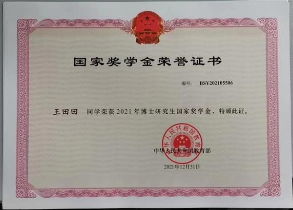 祝賀課題組王田田博士獲得2021年度國家獎學金!