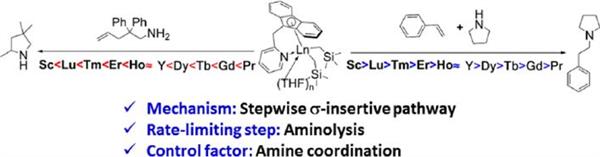Since the precise understanding of the underlying mechanism is important for the rational design of catalysts, much attention has been paid for hydroamination reactions catalyzed by organolanthanides during the past three decades. Distinct mechanisms were proposed on the basis of some key experimental features. It is a challenge to distinguish these mechanisms. The present study focuses on this controversial topic by synthesizing an almost entire range of rare-earth metal bisalkyl complexes (Py-CH2-Flu)Ln(CH2SiMe3)2(THF)x (Ln = Sc (1), Lu (2), Tm (3), Er (4), Ho (5), Y (6), Dy (7), Tb (8), Gd (9), and Pr (10)) stablized by a pyridine methylene ?uorenyl ligand to catalyze intramolecular hydroamination (IAHA) of prototypical 1-amino-2,2-diphenyl-4-pentene and intermolecular hydroamination (IEHA) of styrene and pyrrolidine. Among them, thulium-, terbium-, and gadolinium-based catalysts were investigated for the ?rst time. As observed for all the reported catalytic systems, the rate of IAHA increased almost linearly with increasing metal ion radius, whereas the reactivity pattern in IEHA with respect to the ionic radius size follows the opposite trend. Kinetic studies were carried out to obtain the empirical rate law v = k[Ln]1.0[S]0.0for IAHA and v = k[Ln]1.0[St]1.0[pyrrolidine]0.0for IEHA. The zero-order dependence on amine was attributed to the population ratio between the rare-earth metal amido adduct and its precursor being larger than 104 . Density functional theory studies on scandium, yttrium, and praseodymium complex-mediated IAHA and IEHA were investigated using a stepwise σ-insertive mechanism and a concerted noninsertive mechanism, respectively. The results suggested the prevailing mechanism to be a stepwise σ-insertive pathway that involves the insertion of C-C into the Ln?N bond and protonolysis of the Ln?C bond. The protonolysis reaction is the turnover-limiting step. The reason behind the in?uence of the metal ion radius on the catalytic activity was elucidated.