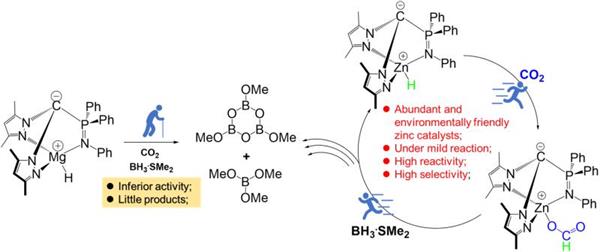 The heteroscorpionate zinc hydride complex LZnH 2, (L = (MePz)(2)CP(Ph)(2)NPh, MePz = 3,5-dimethylpyrazolyl), its formate complex 3, and magnesium hydride complex LMgH 5 with the same ligand were synthesized and detected for the catalytic hydroboration reaction of CO2. With BH3 center dot SMe2 as the reductant, zinc-based hydride complex 2 and formate complex 3 show a similar capability of hydroboration of CO2, featuring excellent reactivity and selectivity. The conversion of BH3 center dot SMe2 reached 84%, the highest TON of 252 compared to other zinc catalysts was achieved at room temperature and borate ester products at reduction levels of CH3OH were obtained. Magnesium-based hydride complex 5 showed inferior activity for the hydroboration reduction of CO2.