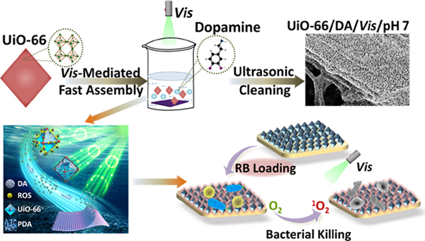 在該體系中,可見光、多巴胺(DA)與待組裝粒子UiO-66具有協同效應:可見光誘導UiO-66產生活性氧(ROS),ROS促進多巴胺聚合,而聚多巴胺(PDA)又可協助UiO-66粒子在表面組裝,形成致密、均勻且穩定的MOF膜,強力超聲處理后仍保持其表面形態。借助MOF膜吸附能力,將光敏劑孟加拉紅(RB)引入MOF膜后,所得到的復合膜展現出對革蘭氏陽性金黃色葡萄球菌(S. aureus)和革蘭氏陰性大腸桿菌(E. coli)的快速光動力殺菌效果(圖1)。該研究成果以“Formation and Antibacterial Performance of Metal?Organic Framework Films via Dopamine-Mediated Fast Assembly under Visible Light”(ACS Sustain. Chem. Eng. 2020, 8, 42, 15834–15842)為題發表在了國際著名期刊ACS Sustainable Chemistry & Engineering,并被選為雜志當期正封面。