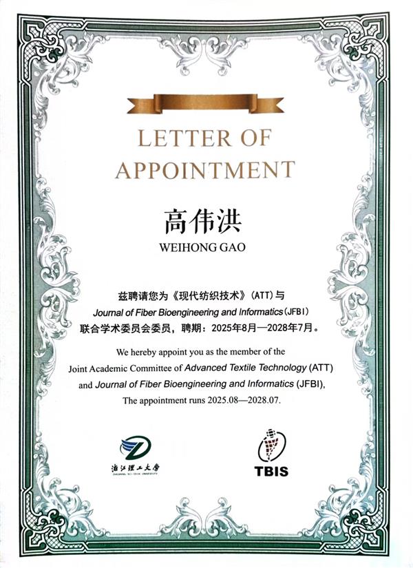 聘請高偉洪為《現代紡織技術》(ATT)與Joural of Fiber Bioengineering and Informatics (JFBI)聯合學術委員會委員