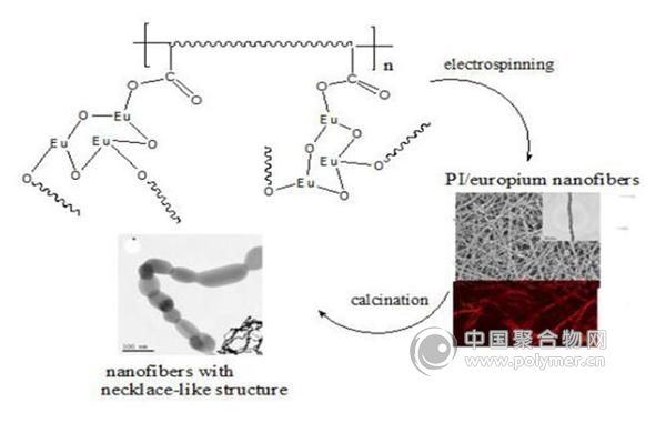 本文報道了利用靜電紡絲結合原位溶膠-凝膠法制備聚酰亞胺/銪的復合熒光納米纖維,并研究了體系中可能存在的反應機理。實驗表明同時進行的亞胺化和凝膠過程導致高分子和銪之間存在很好的化學鍵偶聯(lián)作用,從而提高整個雜化體系的綜合性能。 多種研究手段證實整個雜化納米纖維具有很好的熒光發(fā)射性能,其形態(tài)及性能可通過實驗條件的改變進行有效控制。
