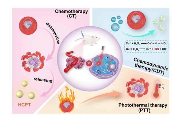 Abstract: Nanoformulations for combining chemotherapy, chemodynamic therapy, and photothermal therapy have enormous potential in tumor treatment. Coating nanoformulations with cell membranes endows them with homologous cellular mimicry, enabling nanoformulations to acquire new functions and properties, including homologous targeting and long circulation in vivo, and can enhance internalization by homologous cancer cells. Herein, we fused multifunctional biomimetic nanoformulations based on Cu-doped zeolitic imidazolate framework-8 (ZIF-8). Hydroxycamptothecin (HCPT), a clinical anti-tumor drug, was encapsulated into ZIF-8, which was subsequently coated with polydopamine (PDA) and red blood cell membrane. The as-fabricated biomimetic nanoformulations showed an enhanced cell uptake in vitro and the potential to prolong blood circulation in vivo, producing effective synergistic chemotherapy, chemodynamic therapy, and photothermal therapy under the 808 nm laser irradiation. Together, the biomimetic nanoformulations showed a prolonged blood circulation and evasion of immune recognition in vivo to provide a bio-inspired strategy which may have the potential for the multi-synergistic therapy of breast cancer.