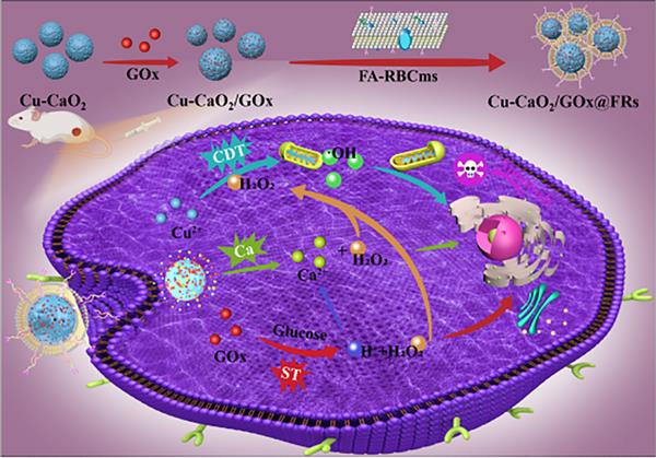 Abstract: In this study, a multifunctional Cu-doped CaO2 nanoreactor loaded with GOx and camouflaged with a folic acid-modified cell membrane?was developed for breast cancer treatment. The as-developed composite nanoreactor showed a synergistic effect on calcium overload to damage mitochondria, thus killing tumor cells to achieve ion interference therapy (IIT). The loaded GOx could deplete glucose to “starve” tumor cells. The H2O2 released by CaO2 decomposition and enzyme catalytic reactions from GOx could not only be highly toxic in the tumor microenvironment but also enhance the efficiency of chemodynamic therapy (CDT) with Cu2+. The red blood cell membranes modified by folic acid achieved a combination of active targeting and passive targeting, thereby enhancing the targeting ability of the as-prepared multifunctional composite nanoreactor and prolonging its retention time at the tumor sites for more than 48 h.
