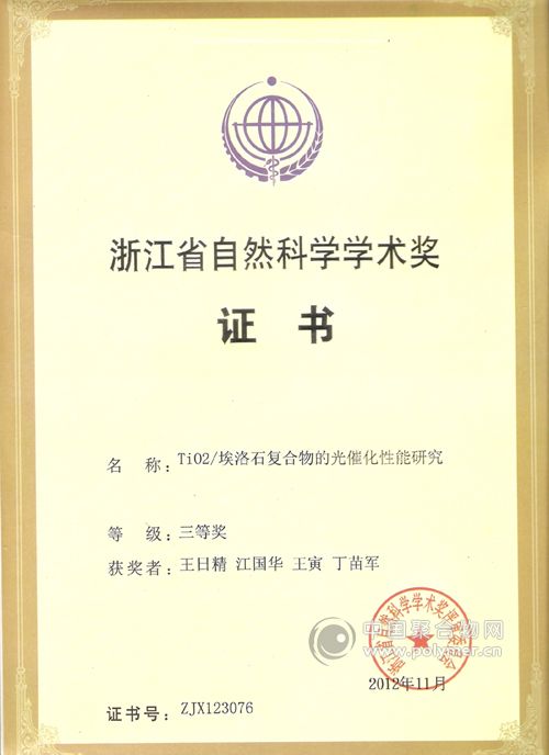本課題組研究成果《TiO2/埃洛石復(fù)合物的光催化性能研究》獲2012年浙江省自然科學(xué)學(xué)術(shù)獎(jiǎng)-三等獎(jiǎng)