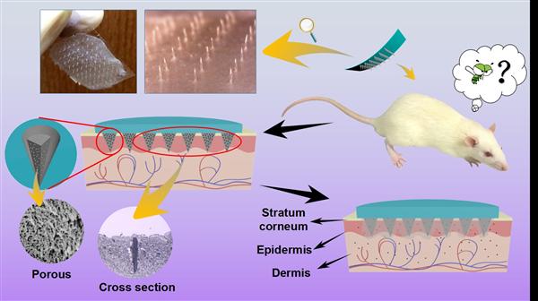 Abstract: To reduce the inconvenience and pain of subcutaneous needle injection, the calcium sulfate and gelatin biodegradable composite microneedle patches with high aspect-ratio microneedles (MNs) and a flexible substrate have been developed. The microneedles with an aspect-ratio approximate 6:1 exhibit excellent mechanical property which can achieve 0.4N for each needle. The cross-section views show the inside of microneedles that have abundant pores and channels which offer potential for different drug-release profiles. The preparation procedures, degradable property for the biodegradable composite microneedle patches are described in the paper. Insulin, the drug to control blood glucose levels in diabetic patients, has been embeded into the biodegradable composite MNs. The hypoglycemic effect for transdermal delivery of insulin is studied using diabetic Sprague-Dawley (SD) rats as models in vivo. After transdermal administration to the diabetic rats, the released insulin from biodegradable composite MNs exhibit an obvious and effective hypoglycemic effect for longer time compared with that of subcutaneous injection route. This work suggests that biodegradable composite MNs containing of insulin have a potential application in diabetes treatment via transdermal ingestion.