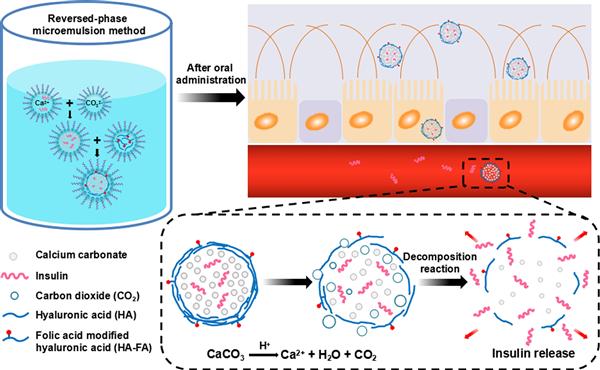 Abstract: A facile and green reversed-phase microemulsion co-precipitation method has been developed for fabrication of CaCO3-based composite nanocarriers (NCs) with hyaluronic acid (HA) coatings for oral delivery of insulin. The cell viability of resultant CaCO3-based composite NCs against HT-29 cells was analyzed with different concentration. The chemical stability of loaded insulin against digestive enzyme was established in presence of simulated gastric fluid (SGF) containing pepsin. The uptake behavior of HT-29 cells was evaluated by confocal laser scanning microscope (CLSM). After oral administration to the diabetic rats, an effective hypoglycemic effect was obtained compared with subcutaneous injection of insulin.