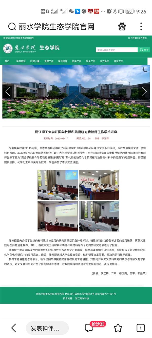 6月16日,江國華教授在麗水學院生態(tài)學院做了題為“高分子微針介導藥物經(jīng)皮遞送研究”的學術報告。