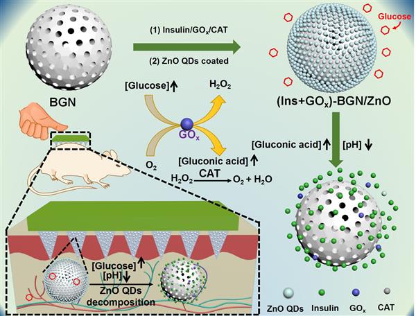 Microneedles integrated with ZnO quantum dots capped mesoporous bioactive glasses for glucose-mediated and pH-induced insulin delivery
