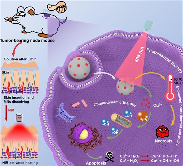 Abstract: Multimodal nanoformulations with limited side-effects for tumor theranostics that catalyze a cascade of intracellular reactions show great potentials for tumor treatment with high specificity and efficiency. In this study, Cu-doped polydopamine nanoparticles (Cu-PDA NPs) have been prepared and embedded into microneedles (MNs) for photothermal and chemodynamic synergistic therapy against skin melanoma, by virtue of enhanced drug transdermal delivery owing to the unique core-shell structure of MNs. This multimodal tumor therapeutic strategy accumulates the high photothermal effect of Cu-PDA NPs (~50.40%) to acquire the energy from NIR irradiation and convert it into heat, and good Fenton-like catalytic activity of Cu+ ions to produce toxic free hydroxyl groups (?OH) by reaction with excessive H2O2 in tumor cells, leading to the generation of a new minimally invasive synergistic therapy. The B16F10 mouse melanoma model demonstrates that the active delivery of Cu-PDA NPs results in greatly inhibit proliferation of tumor and induce mixed necrosis/apoptosis of tumor cells in vivo. This study offers a new avenue for the development of microneedles-based microdevices for skin melanoma by a minimally invasive delivery of multimodal nanoformulation.