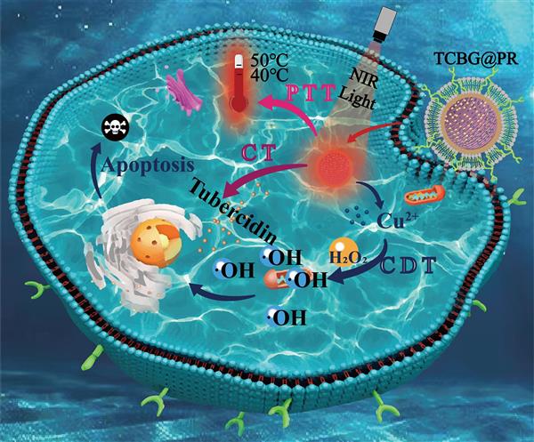 Abstract: Combinations of different therapeutic strategies, including chemotherapy (CT), chemodynamic therapy (CDT), and photothermal therapy (PTT), are needed to effectively address evolving drug resistance and the adverse effects of traditional cancer treatment. Herein, a camouflage composite nanoformulation (TCBG@PRs), an antitumour agent (tubercidin, Tub) loaded into Cu-doped bioactive glasses (CBGs) and subsequently camouflaged by polydopamine (PDA) and red blood cell membranes (RBCm), was successfully constructed for targeted and synergetic antitumour therapies by combining CT of Tub, CDT of doped copper ions, and PTT of PDA. In addition, the TCBG@PR composite nanoformulation was camouflaged with a red blood cell membrane (RBCm) to improve biocompatibility, longer blood retention times, and excellent cellular uptake properties. It integrated with long circulation and multimodal synergistic treatment (CT, CDT, and PTT) with the benefit of RBCms to avoid immune clearance for efficient targeted delivery to tumor locations, producing an "all in one" nanoplatform. In vivo results showed that the TCBG@PR composite nanoformulation prolonged blood circulation and improved tumor accumulation. The combination of CT, CDT, and PTT therapies enhanced antitumour therapeutic activity, and light-triggered drug release reduced systematic toxicity and increases synergistic antitumor effects.